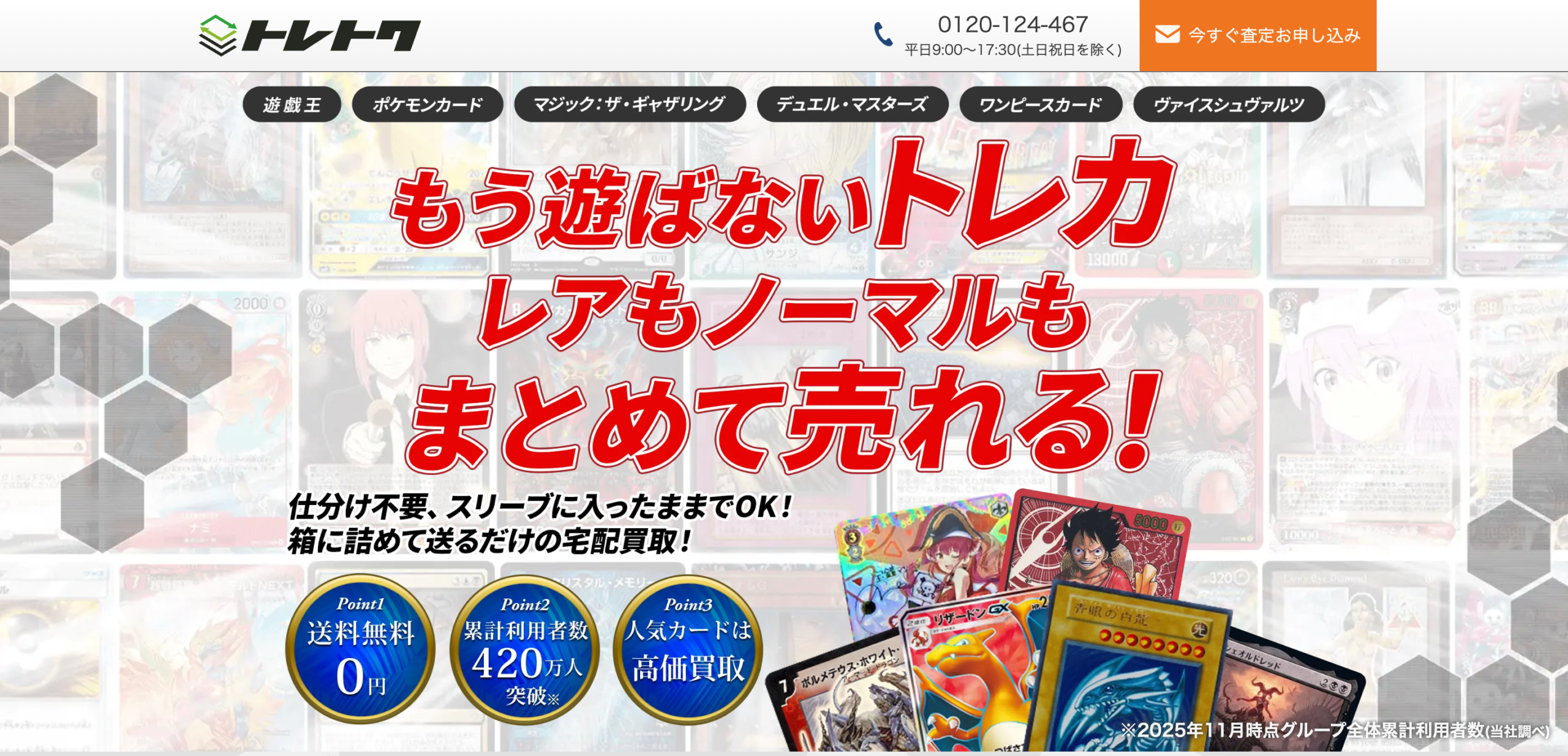 長年集めてきた遊戯王、ポケモンカード、マジック:ザ・ギャザリングなどのトレーディングカード(TCG)。「引退するのでまとめて整理したい」「価値があるカードを正しく評価してほしい」と考えているなら、「トレトク」が最適です。トレトクは、全国対応の宅配買取に特化したトレカ専門店で、プロの鑑定士による精緻な査定が多くのファンから支持されています。